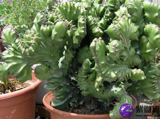 金麒麟学名为帝国缀化,在一些地区也被称为厚目麒麟,是一种厚肉质植物,是仙人掌类植物中最原始的类群之一,原产于美洲。由于酷似我国古代传说中的麒麟,我们中国人就叫它玉麒麟,由于夜晚被灯光照射时植株上的刺会反射出闪闪金光的特点,又叫金麒麟。金麒麟形态奇特,喜欢阳光充足,但又耐半荫,稍旱也不会干死,适于家庭盆栽观赏。