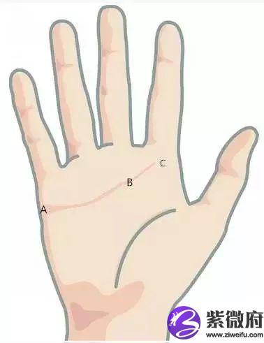 感情线的长短,由掌边延伸至中指和食指之间对下的地方(中指对下为土星丘,食指对下为木星丘),也就是在土星丘和木星丘之间的位置,视为合格。如下图,比AB长的为长,比AB短的为短。