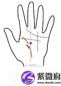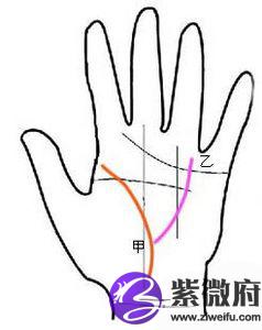 2、生命线出现中断(甲),靠震宫旁出现贵人纹(乙)