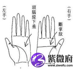 把左右手一起摊开来看时,头脑线如果是向着同样方向伸展出去的,就是这人一生中,也不会有多大的变化。若果头脑线的左右两方,有很大的差别,那就得仔仔细细看一看了。譬如右手的头脑线是从生命线的内部伸展出来,而斜斜的向下方低垂,而右手的头脑线,起点尽管相同,而成为一条直线横过手掌的,是带有先天性的神经质而意志也是非常薄弱的,不过在环境的磨练下,意志也会坚强起来,同时也会奋发努力,能够在自己的努力下开拓命运。