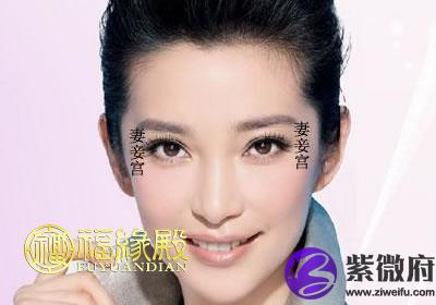 夫妻宫(妻妾宫)眼晴的尾部鱼尾及鱼尾外侧奸门部位。现代实行一夫一妻制,不允许重婚纳妾,应该扬弃妻不如妾,妾不如偷的观念。避免外遇问题。所以眼尾妻妾宫部位要丰隆平满,如果妻妾宫有缺点,深陷纹多疤痕,都容易导致婚姻不正常,甚至发生问题。