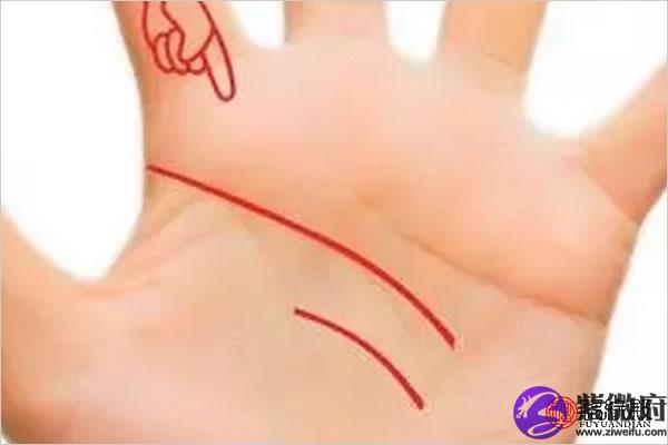 有时候你会遇到这种情况,也就是智慧线在手掌处中断,另一条线前端向上直冲,看起来像两条。而这种手相不属于两条智慧线,只属于分叉。拥有这种手相的女人天生比较自私自利,好追求名利,在中年时期,家中事业很容易落败。