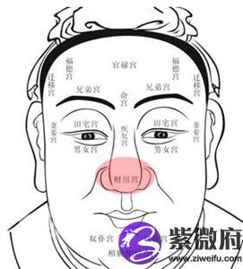 天仓、地库、金甲(鼻翼)、二阴(鼻孔),并曰财帛宫。丰满明润,财帛有余,忽然枯削昏黑,财帛消乏。有天无地,先富后贫;天薄地丰,始贫终富。天高地厚,富贵荫及子孙;额尖狭窄,一生贫寒到老。井灶破露,橱无宿食;金甲匱丰,富贵不穷。气色昏黑,主破失财禄;红黄色现,主进财得禄。青黄贯鼻,主得横财;二柜丰厚,明润清和。赤主口舌,谨慎少言。