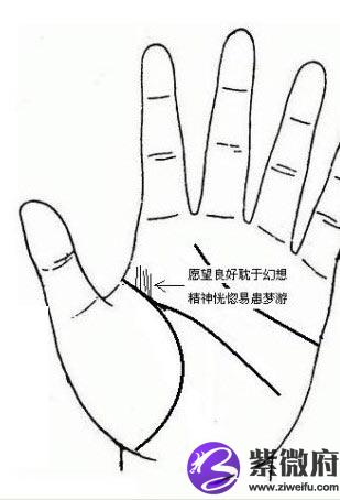 而在此位置上有过多的上进线(如下图),则表示精力太过分散,耽于幻想,以至精神恍惚易患梦游之症。要关注其心理健康状态,注意是否有对其进行心理干涉的必要。