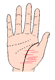 生命线从起点至末端不间断,更刻着深而又鲜明的线条,此线如稍带红色,表示体力充沛,能做大事业;相反的线短或断断续续或成为链状或出现十字形等,表示坏的记号,主有病弱或受伤的预兆;生命线多半在起点附近成锁链状,且下部分叉成几条,尤其线的下部,交插(命运线)或(健康线),所以生命线之形状显得不完整,往往很容易成为不规则;下部从生命线之流年来看,等于进入身体衰弱的老年期,所以线无劲而乱,是当然的。