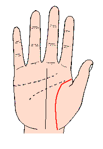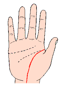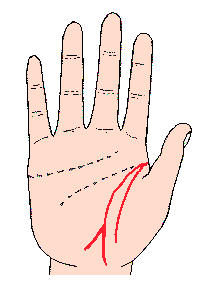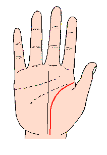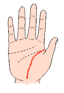 生命线是食指与拇指之间,以半圆形包围拇指球的线,任何人的手都刻有此线;最好的生命线,是深刻包围拇指球至底部,忌短及在中部终止或断续的线,又有流向月丘的线,有的紧包围拇指球,也有较宽包围等各种线。