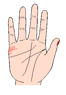 结合线很短又不规则,而且很多条(如下图),这种手相的人无论他结婚与否,和异性交往总是很多,这是多情的相,男性有此相的,对女性至为亲切,但容易因此而遭来祸害。有人说有一条结合线会结一次婚,两条线的会结两次,这是传说,其实只有一条结婚线,而结婚多次的也有,有两条结婚线而夫妇感情融洽的也不乏其人;而左右双手结婚线均在同样位置,而且刻划水平的人,表示夫妇感情好,万一因故而分离,也能够靠下一个配偶来弥补爱的喜悦。