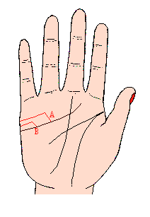 由结合线伸出的长线,进入生命线内部(记号B)(如下图),表示夫妇之间将发生重大问题,令人注目;在这条线上有岛形,表示常因三角关係演变到身上重要问题,纵然这条线在中途稍有中断,其意义也是一样。