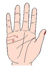 由结合线分出小小线条的尖端,在太阳丘下面下垂的人(记号A)(如下图),是夫妇缘份较差,可能由于对方病弱或性格有缺点,以致自己被拖累而命运欠佳,这类人总是不停批评对方,说对方的是非,但是却不致于马上仳离。